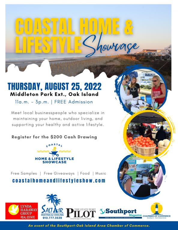The Coastal Home and Lifestyle Showcase is held annually at Middleton Park Extension, 4610 E. Dolphin Drive, Oak Island. The Showcase is a public event organized by the Southport-Oak Island Area Chamber of Commerce to showcase our area business community who can assist you with all aspects of home, garden and coastal lifestyle. There will be many free giveaways provided by the participating businesses.